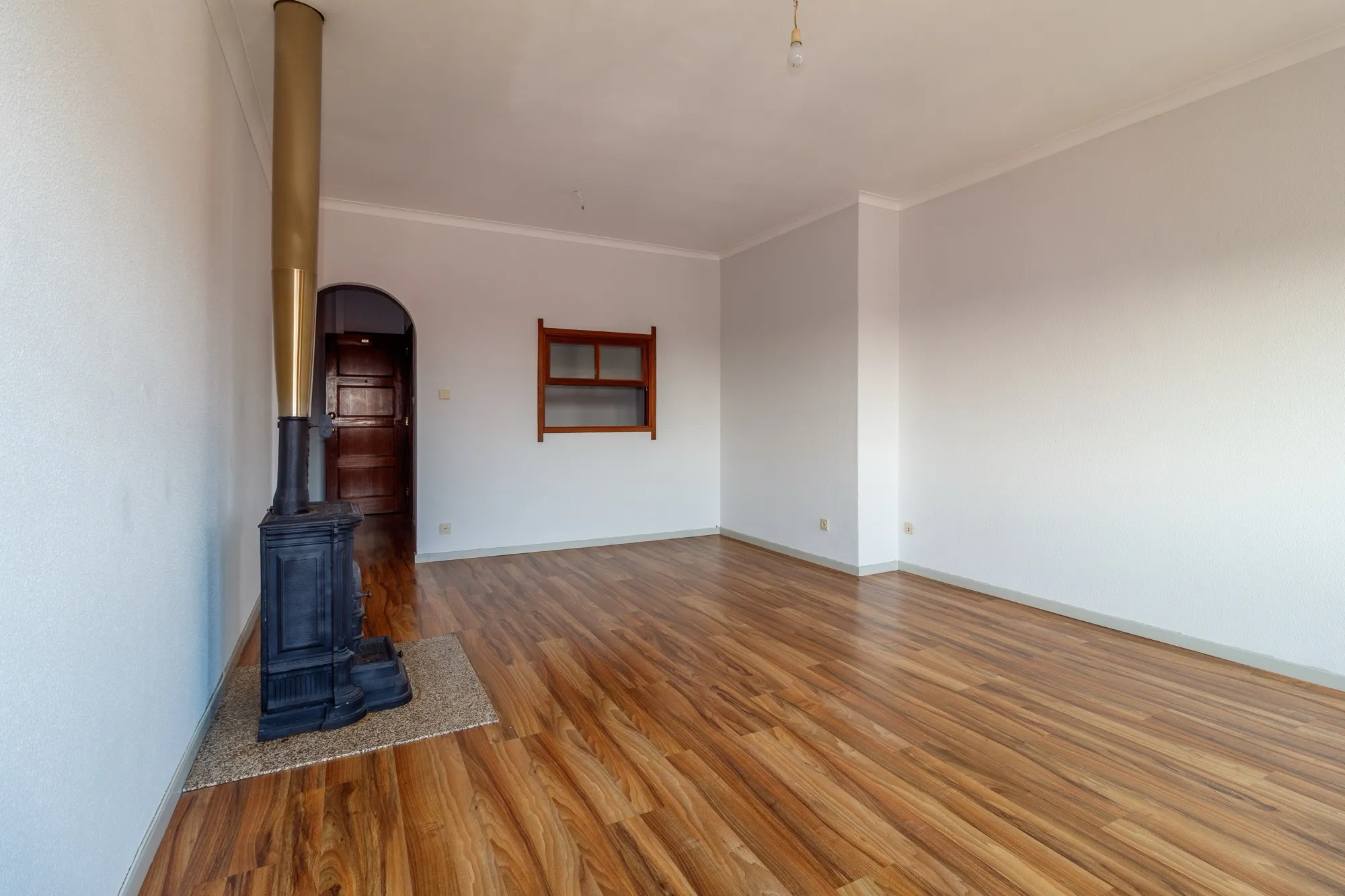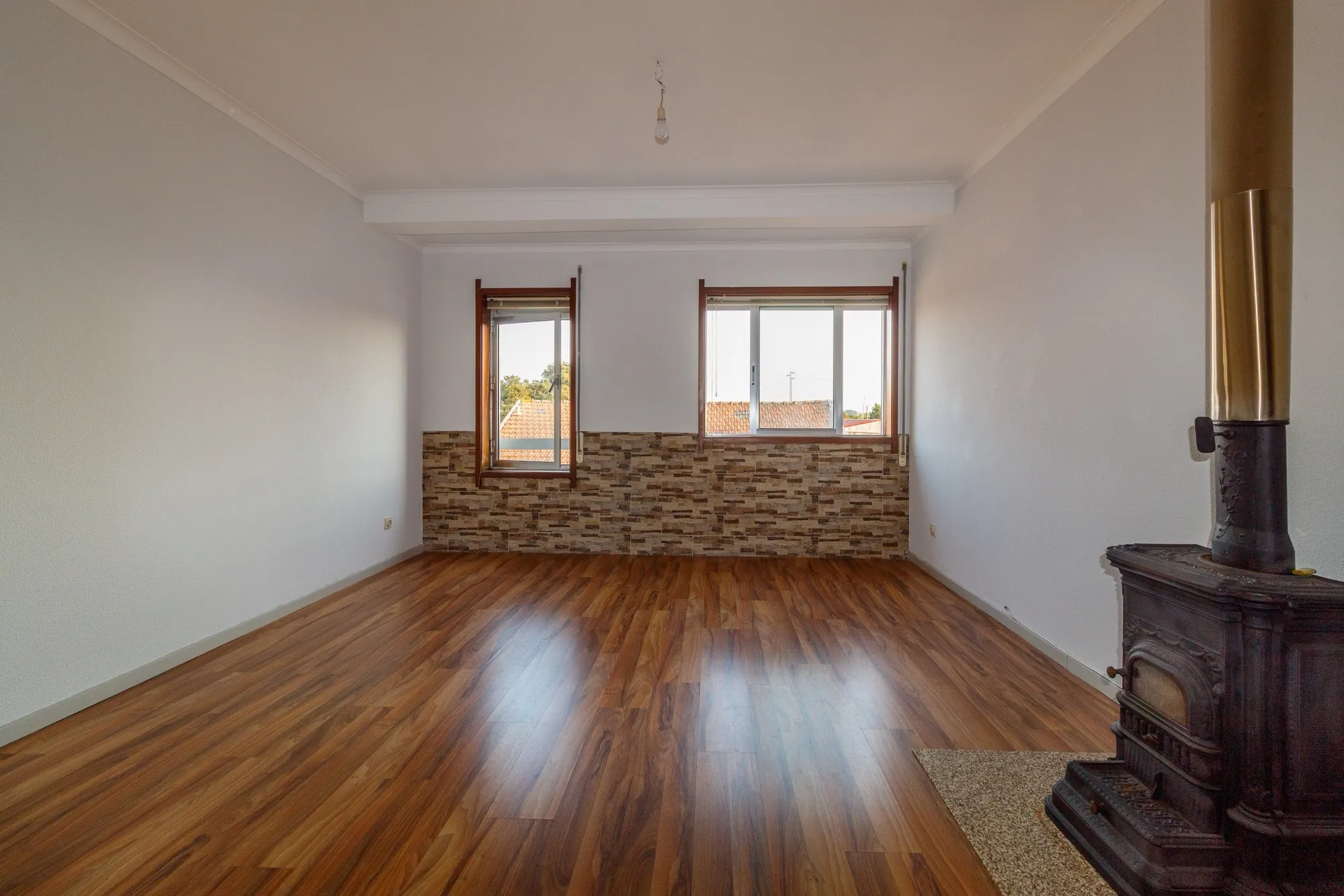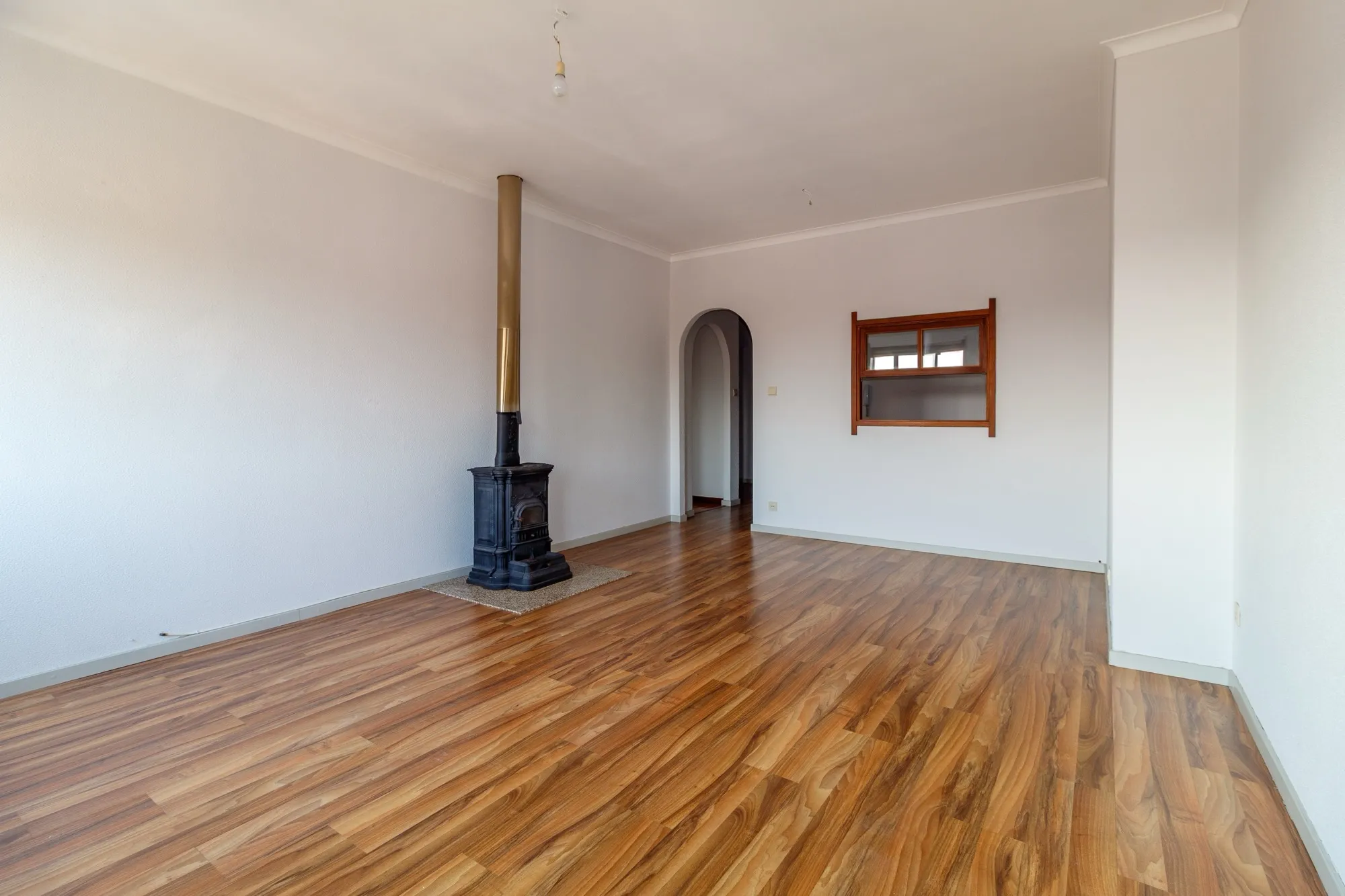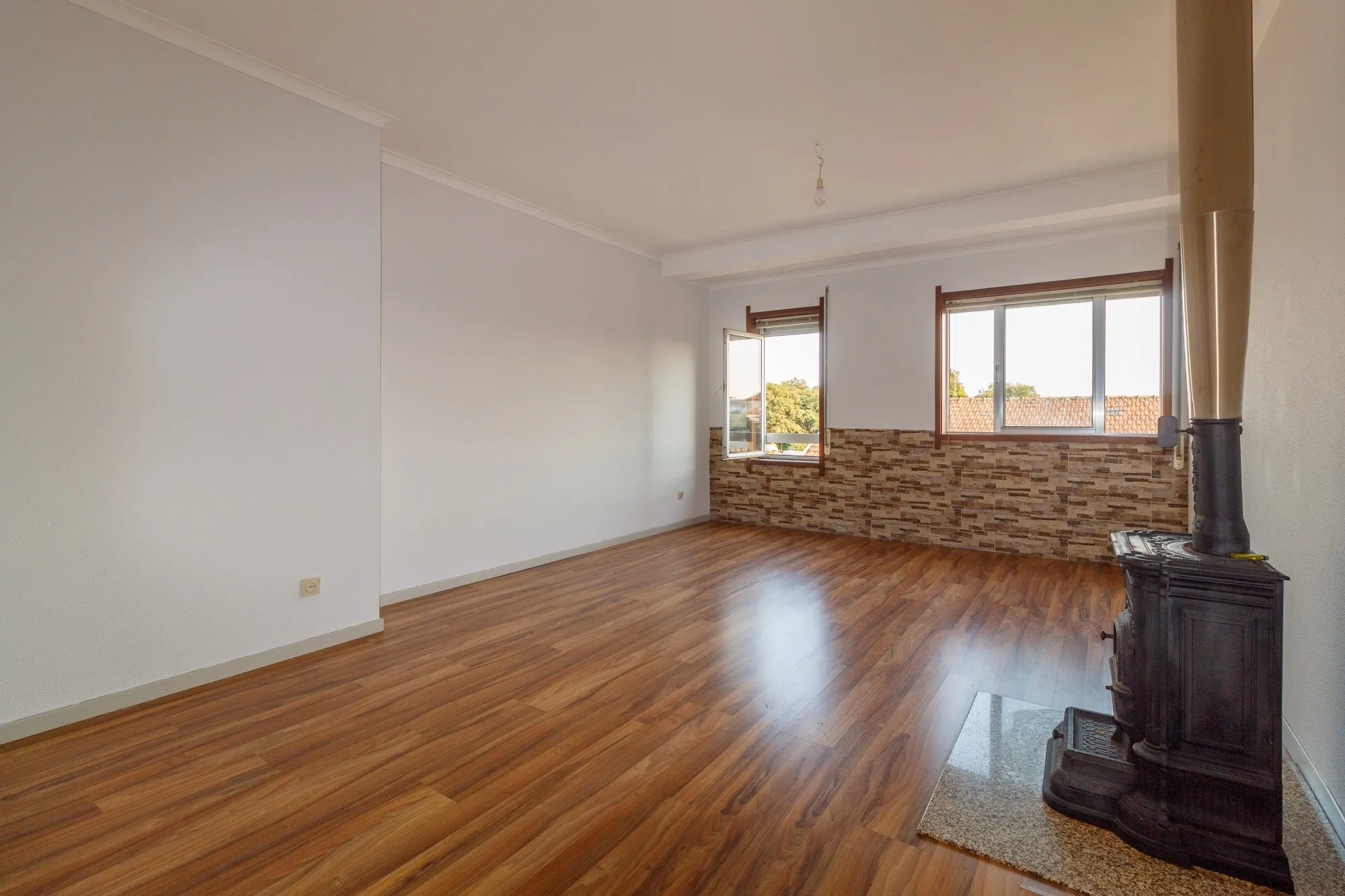 A sala tem uma nova instalação de chão flutuante e uma salamandra a lenha, perfeita para aquecer os dias mais frios.